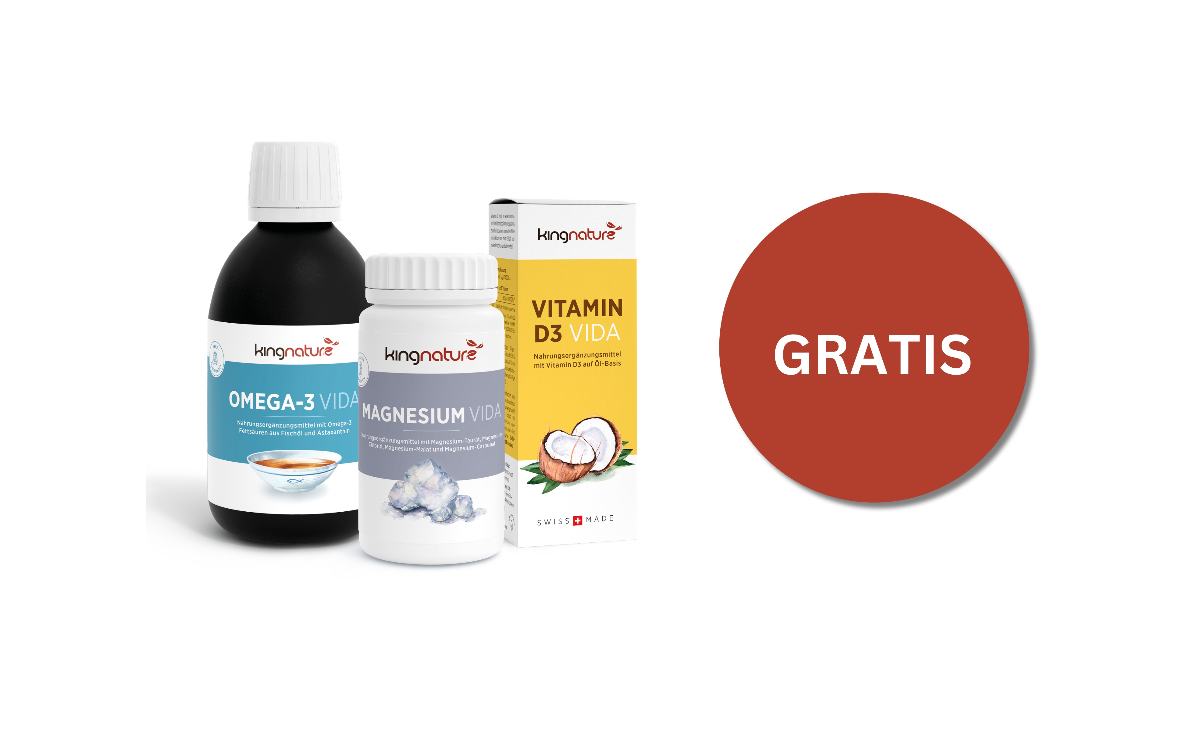 Als Neukunde profitierst Du von einem attraktiven Kennenlernangebot: bei einer Bestellung im Webshop von Kingnature ab einem Warenwert von CHF 250 bekommst Du ein Immunpaket im Wert von CHF 77.80 geschenkt. Darin enthalten sind die „Big Three“: Vitamin D3, Omega-3 Fettsäuren und Magnesium – essentielle Vitalstoffe, bei denen viele Menschen, insbesondere auch in der Schweiz, unterversorgt sind. Dein Geschenk bekommst Du auch als neu registrierter Reseller (Mindestbestellmenge: CHF 250). Wir verraten Dir den Gutscheincode unter [email protected].
